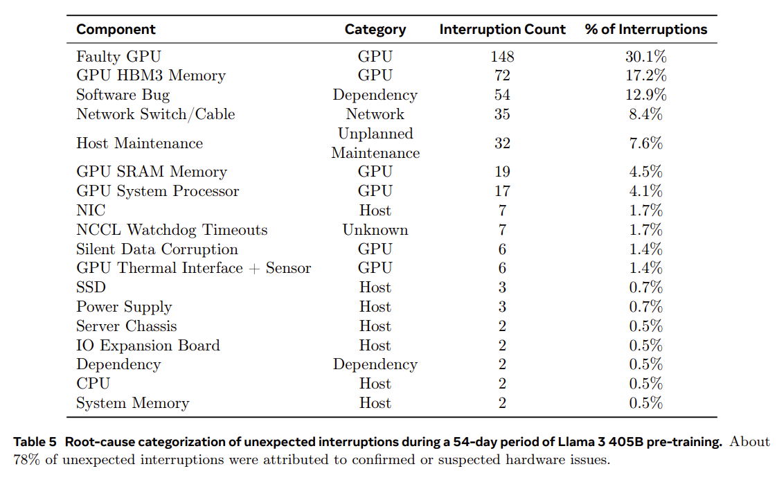 To illustrate the common issues faced during large-scale training runs, here are the interruption categories Meta encountered during their 54-day training run for Llama3: